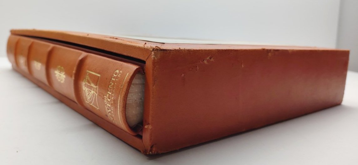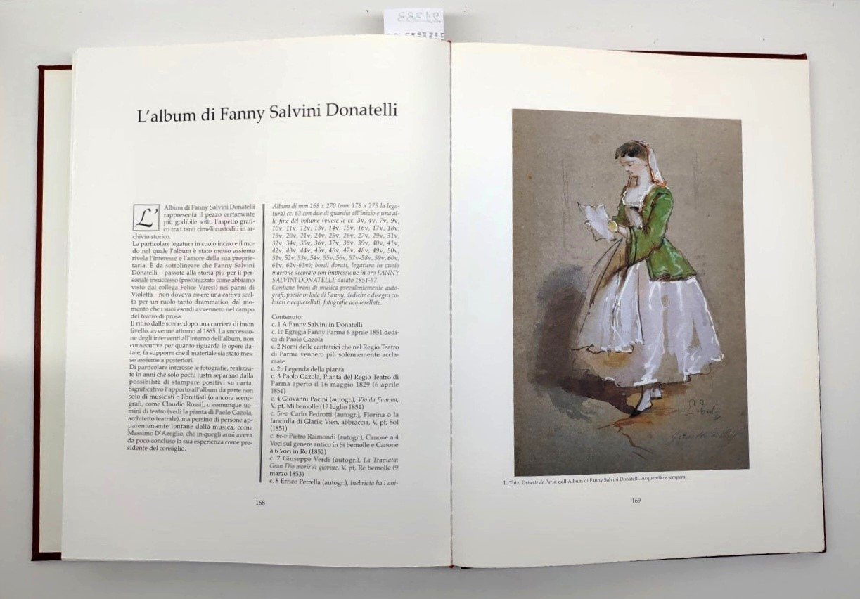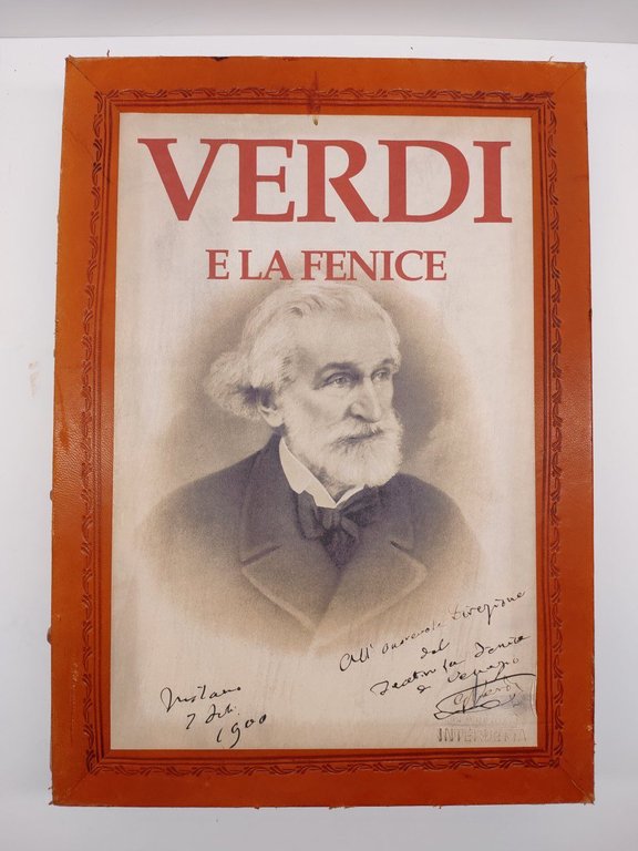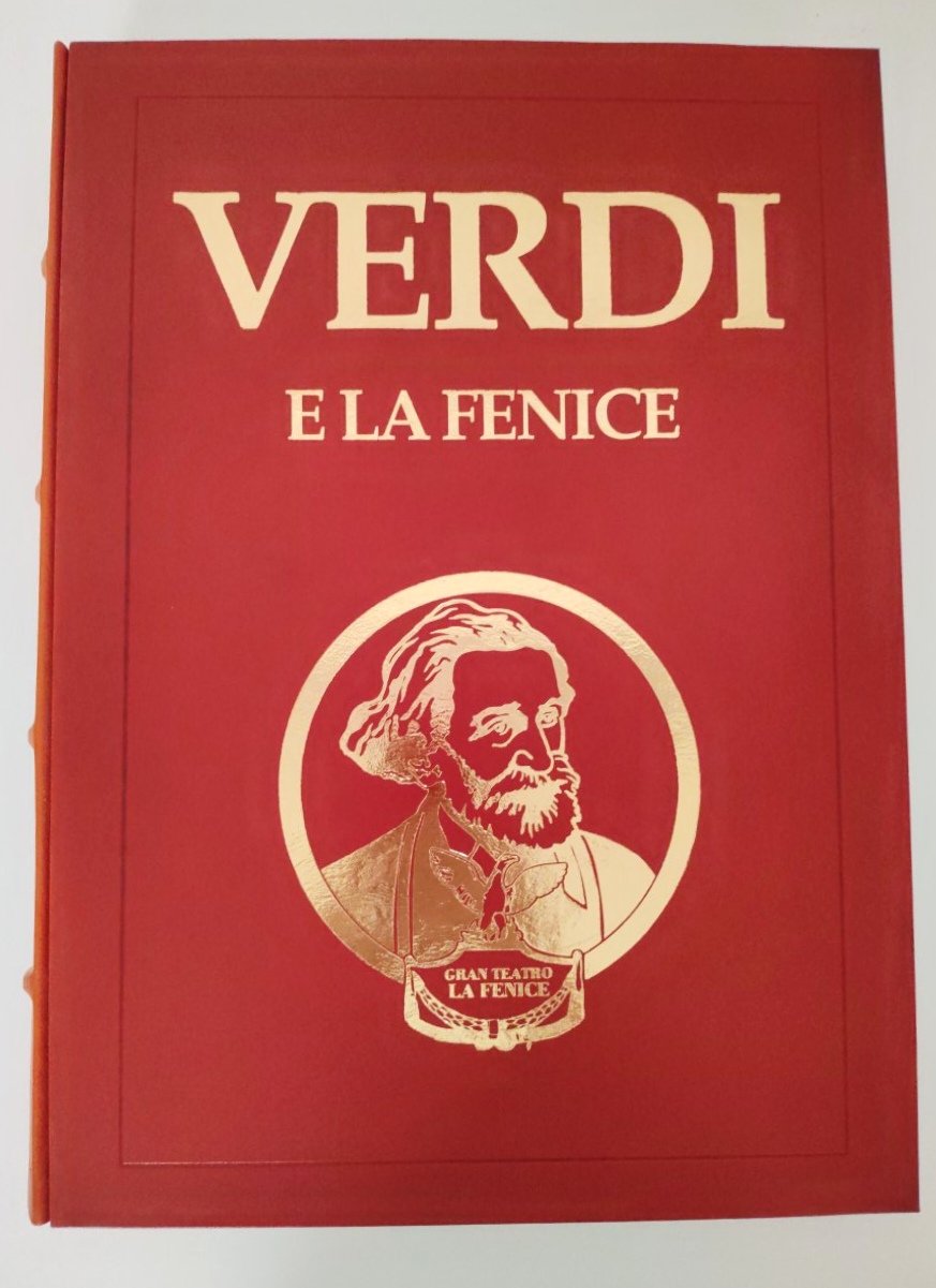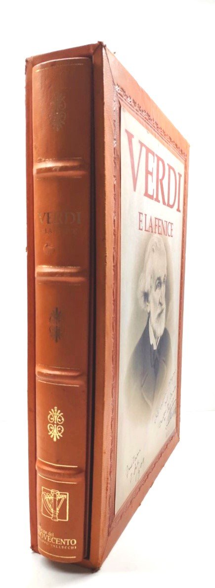 Tiratura limitata del volume in 1999 esemplari numerati, cofanetto in marocchino con ritratto di Verdi applicato, lievi abrasioni e segni del tempo, legatura editoriale in pieno marocchino color mattone, titolo e ritratto di Verdi impressi in oro sul piatto anteriore, dorso a 4 nervi con titolo e fregi dorati con lievi abrasioni, dorso staccato e re incollato dal precedente proprietario, , alone di colla alla cerniera, tagli inferiori con qualche lieve sporcizia, interno il buono stato, illustrazioni a colori comprese nella paginazione. Carta speciale realizzata dalle cartiere Miliani Fabriano, legatura a mano, custodia e fregi realizzati da L'Arte del Libro, Todi numero pagine 208 dimensioni cm 43,5 * 31 * 8,5