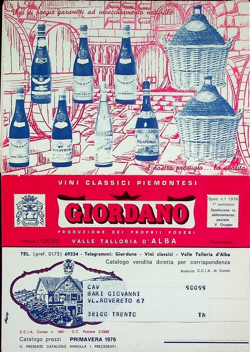 Vini classici piemontesi: Giordano: Valle Talloria d'Alba. | Rare and modern books | [Vini - Alba - Piemonte].