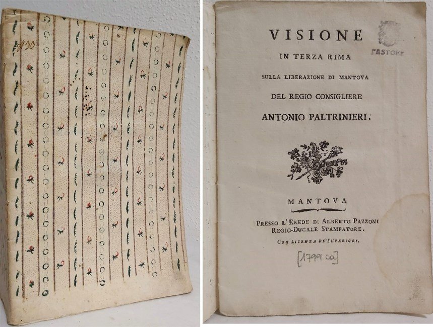 in-8 gr., pp. 20, graziosa leg. carta dec. coeva. Fregio xilogr. al front. L'A. fu accademico e giurista mantovano (1750-1815). Operetta piuttosto rara, censita in sole 3 biblioteche italiane, dedicata alla liberazione di Mantova dai Francesi dopo l'assedio. Lieviss. insignificante alone marginale. Bell'esempl. su carta forte. [185]