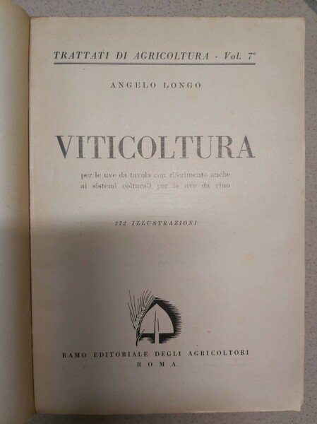 gr. vol. in-4, pp. 614, bross. edit. con sovracop. a colori. Con 272 ill. n.t. Il più ampio e completo lavoro del Longo per la prima volta apparso su un volumetto del 1930. Imp. testo sulle varietà, i caratteri e la maturazione della uve. [MM15-258]