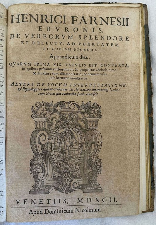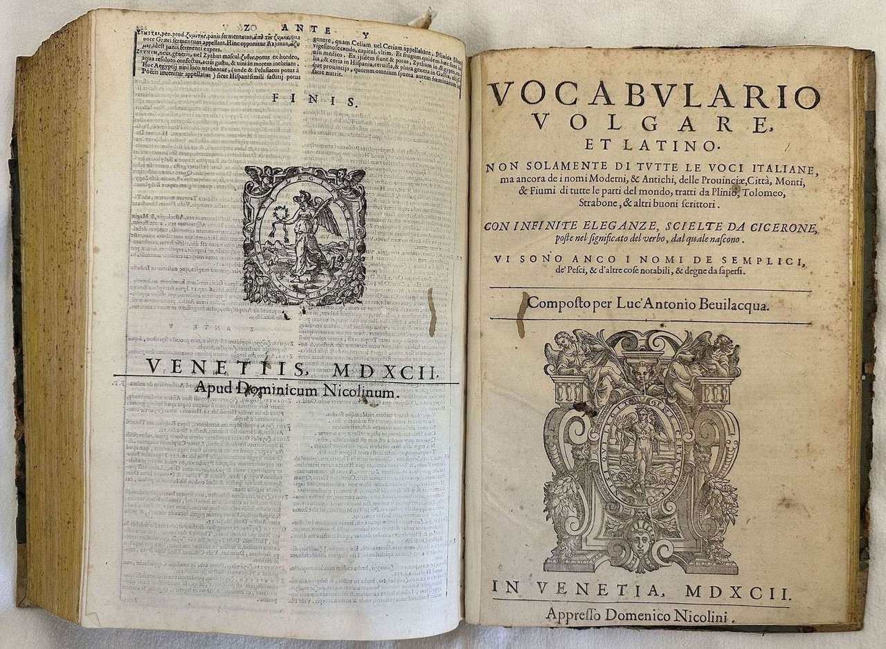 Edizione del 1592 del celebre vocabolario scritto da Ambrogio Calepio (1435 - 1511) linguista italiano detto anche Calepino il cui nome di battesimo era Giacomo nato da una ricca e nobile famiglia di Bergamo. La celebrità dell'opera fu tale che "Calepino" divenne sinonimo scherzoso del dizionario.<BR><BR>Il dizionario nacque como un monolingua al quale successivamente vennero aggiunte altre lingue.<BR><BR>L'opera è composta da tre parti legate insieme: Vocabolario latino italiano; Vocabolario italiano latino e un appendice sui verbi a cura di Enrico Farnese (m. 1619). Risulta mancante il frontespizio del primo tomo e pag. 25 dell'appendice.<BR><BR>Bei capilettera decorati.<BR><BR>Marca editoriale al frontespizio: Ancora con delfino in una corona di frutti e foglie d'alloro. Ai lati la scritta Aldus.<BR><BR>In buone condizioni.<BR><BR>Copertina in mezza pergamena muta posteriore in buone condizioni generali con lievi usure marginali. Legatura in buone condizioni. All'interno le pagine si presentano in buone condizioni con fioriture. Rinforzo al margine di piegatura della prima carta e pag. 7. . Frontespizio del primo tomo e pag. 25 dell'ultimo dizionario è mancante. Parte mancante a pag. 208 e pag. 197 parte seconda con leggera perdita di testo. Macchia di inchiostro a pag. 7 della seconda parte con perdita di testo. Parte starappata a pag. 7. Segno di tarlo al margine di piegatura da pag. 63 a 98 con leggera pedita di testo. In folio. Dim. 33,5x22 cm. Pp. 234+223+40+20+16. Peso Kg. 2,640Edition of 1592 of the famous vocabulary wrtitten by Ambrogio Calepio (1435 - 1511) italian lexycographer also known as Calepino also named Giacomo born in a rich and noble family in Bergamo. The dictionary was created as a monolanguage to which other languages were added. <BR><BR>The work is amde up of three parts bound together: Vocabolario latino italiano; Vocabolario italiano latino e un appendice sui verbi a cura di Enrico Farnese (m. 1619). Risulta mancante il frontespizio del primo tomo e pag. 25 dell'appendice.<BR><BR>Beautiufl decoratd capital letters.<BR><BR>Editorial mark in the title page: Ancora con delfino in una corona di frutti e foglie d'alloro. Ai lati la scritta Aldus.<BR><BR>In good conditions.<BR><BR> <BR><BR>Half parchment cover in good conditions lighlty worn in the extremities. Binding in good conditions. Pages in good conditions with foxings. <BR><BR>Reinforcement in the first page in pag. 7. . Title page of the first tome and pag. 25 of the last rome is missing. Missing part in pag. 208 and pag. 197 of second part with light loss of text. Ink stain in pag. 7 of the second part with loss of text. Teared part in pag. 7. Worming in the folding edge in pag. 63 to 98 with light loss of text. In folio. Dim. 33,5x22 cm. Pp. 234+223+40+20+16. Peso Kg. 2,6