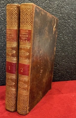 8vo (cm. 20), due Voll., 4 cc.nn., 392 pp.; 2 cc.nn., 371(1) pp. Graziose, differenti vignette calcografiche ai due frontespizi. Legature coeve in piena pelle con ricche decorazioni e titoli in oro su doppio tassello al ds. (minime tracce d’uso e alcuni percorsi di tarlo sui piatti). Tagli spruzzati. Esemplare in ottimo stato di conservazione. Edizione originale di questo resoconto di viaggio dell’archeologo francese Millin (1759-1818), di notevole interesse per la storia dell’arte. Sono pure comprese le più belle località dei laghi di Como, Lecco e Maggiore. Cfr. Brunet III, 1723; Cicognara, 4144; Fossati Bellani I, 475.