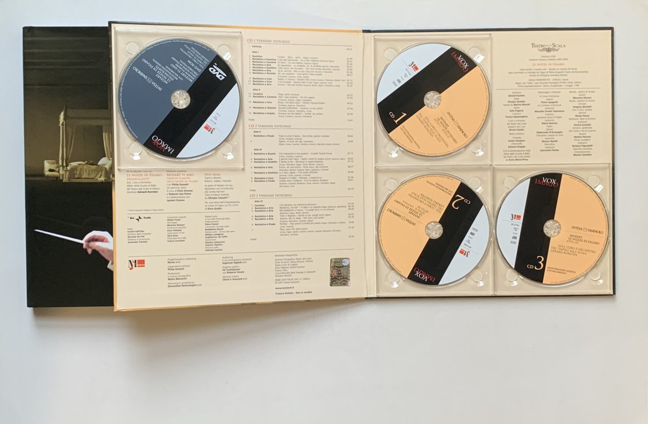 ed. speciale, limitata e non in vendita: strenna Intesa SanPaolo 2007. Collana multimediale a cura di Electa / Musicom "Vox Imago". Rappresentazione: Teatro alla Scala, direttore Gérard Korsten, febbraio 2006. Ricerca iconografica: Elisa Dal Canto, Simona Pirovano, e, per la sezionerelativa al maestro Gérard Korsten, Mario Marcarini. Impaginazione: Francesca Rossi. Design copertina: FG Confalonieri. Opera in due volumi in-8° grande, quasi quadro contenuti entro cofanetto editoriale in cartoncino liscio nero con titoli in nero lucido. L'opera contiene un DVD-ROM e tre CD. Stato buono-ottimo (lieve usura del cofanetto - DVD-ROM e CD funzionanti): volume primo (cart./ sovraccoperta patinata con grafica in n/b ed illustrata a colori ai piatti con un fotomontaggio (fra cui: Maestro Gérard Korsten, fotografia di Priamo Tolu, su gentile concessione del Teatro Lirico di Cagliari/ 144 con illustrazioni in b/n e a colori): foreword/ presentazione; Giovanni Bazoli (Chairman of the Supervisory Board/ Presidente del Consiglio di Sorveglianza) - La vita messa in scena (Prologo; Lorenzo Da Ponte-Memorie - Mozart e i suoi librettisti; Ettore Napoli - La commedia umana; Giovanni Carli Ballola - Le nozze di Figaro; Philip Gossett - Trama dell'opera -Le nozze di Figaro; Jean Starobinski - Figaro e Beaumarchais: la rivincitta del Terzo Stato; Armando Torno - Wolfang, Vienna e Praga; Mario Marcarini) - 1784. Intorno a Figaro ("Davanti al nobile nostro signor...". Secolo dei lumi? - "E al suon di lieta marcia corriam tutti a festeggiar...". L'età della gioia - "Voi che sapete che cosa è amor...". L'erotismo ai tempi di Figaro - "Più alto quel colletto...". Una moda di transizione - "Dunque in giardin verrai?...". Dal giardino barocco al giardino rococò) --- volume secondo (camicia rifinita in carta patinata con grafica in n/b ed illustrata a colori ai piatti con un fotomontaggio. La camicia contiene un DVD-ROM e tre CD contenenti rispettivamente gli Atti I e II, gli Atti II (continua) e III e l'Atto IV).