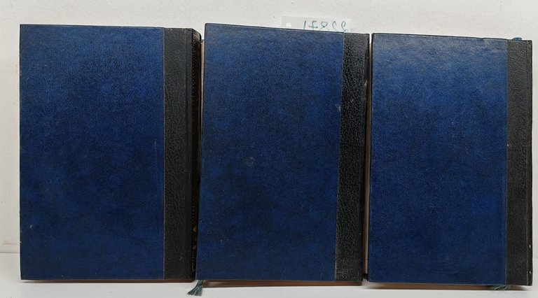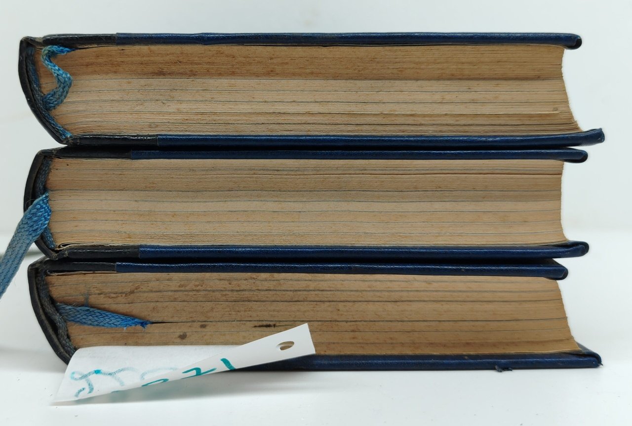 Legatura rigida in pelle con fregio impresso al piatto anteriore e titolo al dorso, alcune sporcizie e segni del tempo, tagli bruniti con fioriture diffuse, fogli di guardia illustrati, interno in discreto stato, 3° volume deformato al dorso, una rottura al margine superiore del piatto anteriore e al margine interno dell'antiporta, alcune fioriture le pagine interne maggiormente presenti alle prime due ultime pagine, numero pagine 249 + 248 + 252 + indice, dimensioni di ciascun volume cm 18 x 12,5