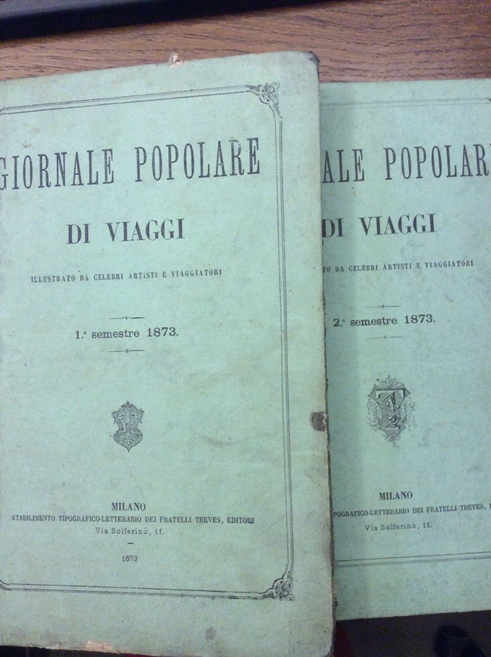 In-4 p. (mm. 305x210), 2 volumi, mz. tela editoriale (lievi macchie; tracce d'uso), pp. 16 cad. fascicolo, con numerose xilografie e cartine geografiche. Di questa rivista settimanale di viaggi, geografia, etc., nata il 15 gennaio 1871 come continuazione del "Giro del mondo", offriamo il 1873, completo e diviso in due semestri. Edizione popolare, che ha visto tra i collaboratori anche Jules Verne. Fioriture e arrossature, ma complessivamente testo in buono stato.