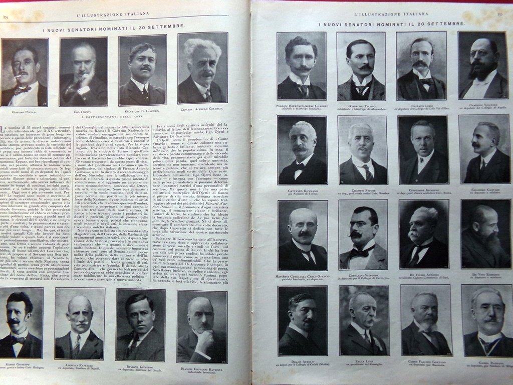 I nuovi senatori nominati il 20 settembre (tutte le fotografie): Giacomo Puccini, Ugo Ojetti, Salvatore Di Giacomo, Giovanni Alfredo Cesareo, Albini Giuseppe, Angiulli Raffaele, Bevione Giuseppe, Bianchi Giovanni Battista, Borromeo-Arese Gilberto, Borsalino Telesio, Callaini Luigi, Camerini Vincenzo, Cattaneo Riccardo, Ciccotti Ettore, Cirincione Giuseppe, Colosimo Gaspare, Cornaggia Carlo Ottavio, Cottafavi Vittorio, De Tullio Antonio, De Vito Roberto, Drago Aurelio, Facta Luigi, Falconi Gaetano, Gabba Bassano, Garbasso Antonio, Giordano Davide, Lanza di Scalea Giuseppe, Luiggi Luigi, Majorana Giuseppe, Marcello Gerolamo, Marghieri Alberto, Mele Davide, Orsi Delfino, Pelli-Fabbroni Giovanni, Raggio Carlo, Raineri Givoanni, Rosadi Giovanni, Rota Francesco, Segrè Salvatore, Silvestri Giovanni, Sitta Pietro, Treccani Giovanni, Venturi Adolfo, Zerboglio Adolfo