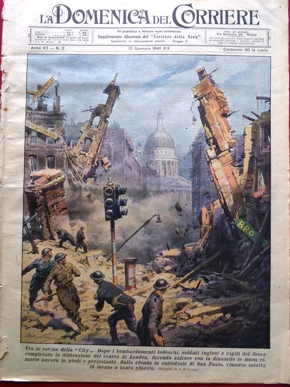 La Domenica del Corriere 12 Gennaio 1941 WW2 Bombardamento a Londra Pascoli Rodi