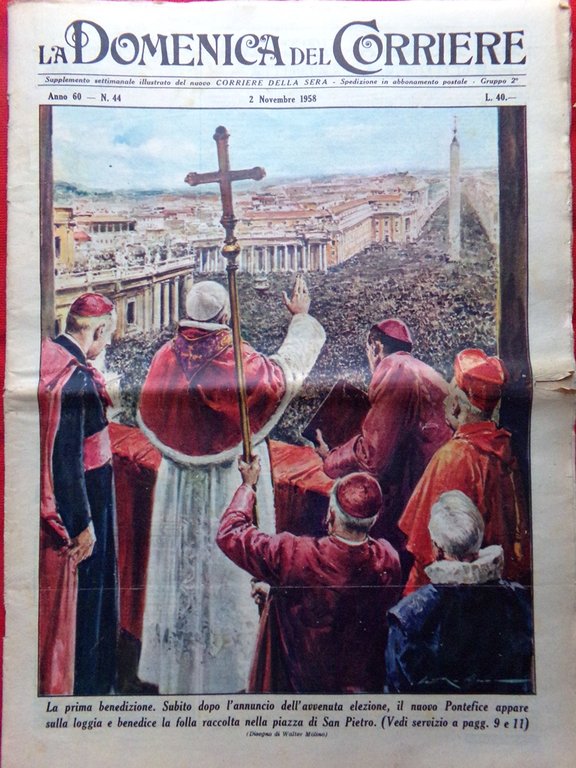 La prima benedizione di Papa Giovanni XXIII. Subito dopo l'annuncio dell'avvenuta elezione, il nuovo Pontefice appare sulla loggia e benedice la folla raccolta nella piazza di San Pietro (Walter Molino)