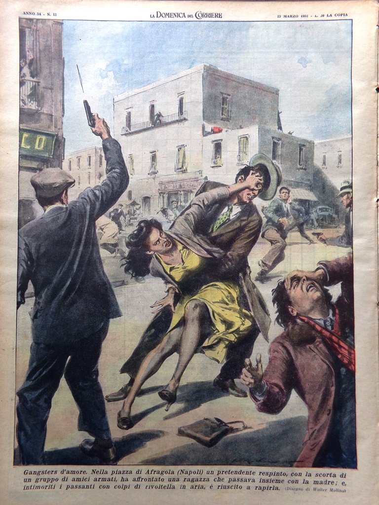 Gangsters d'amore. Nella piazza di Afragola (Napoli) un pretendente respinto, con la scorta di un gruppo di amici armati ha affrontato una ragazza che passava insieme con la madre ed è riuscito a rapirla (Walter Molino)