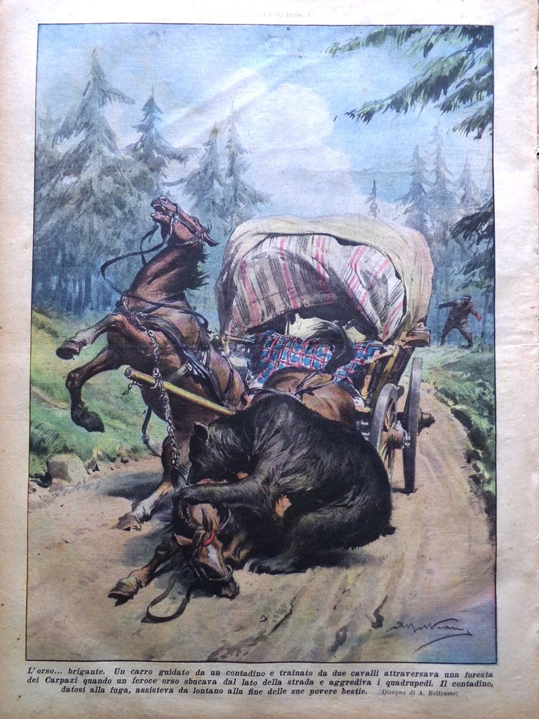 L'orso.brigante. Un carro guidato da un contadino e trainato da due cavalli attraversava una foresta dei Carpazi quando un feroce orso sbucava dal lato della strada e aggrediva i quadrupedi. Il contadino, datosi alla fuga, assisteva da lontano alla fine delle sue povere bestie (Achille Beltrame)