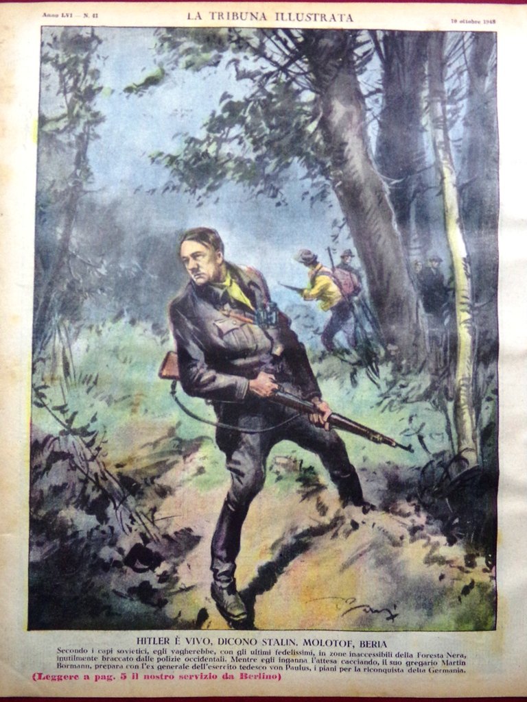 Hitler è vivo, dicono Stalin, Molotof, Beria: secondo i capi sovietici, egli vagherebbe, con gli ultimi fedelissimi, in zone inaccessibili della Foresta Nera, inutilmente braccato dalle polizie occidentali. Mentre egli inganna l'attesa cacciando, il suo gregario Martin Bormann, prepara con l'ex generale dell'esercito tedesco Von Paulus, i piani per la riconquista della Germania (disegno di Vittorio Pisani)