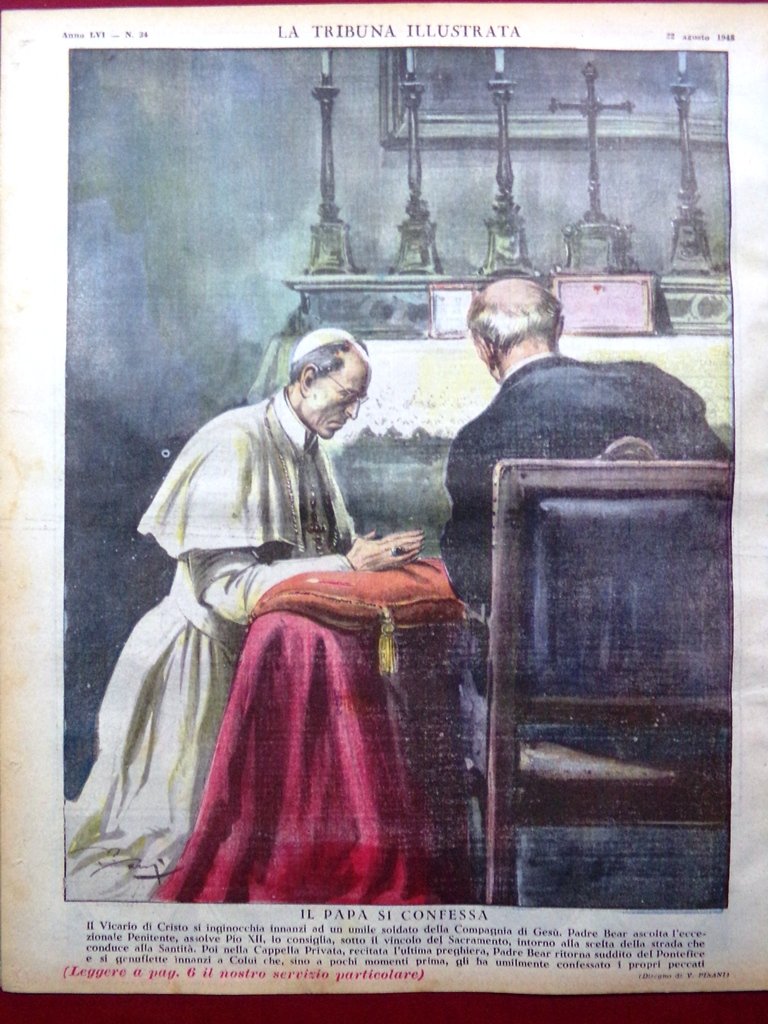 Il Papa si confessa: il Vicario di Cristo si inginocchia innanzi ad un umile soldato della Compagnia di Gesù. Padre Bear ascolta l'eccezionale Penitente, assolve Pio XII, lo consiglia, sotto il vincolo del Sacramento, intorno alla scelta della strada che conduce alla Santità. Poi nella Cappella Privata, recitata l'ultima preghiera, Padre Bear ritorna suddito del Pontefice e si genuflette innanzi a Colui che, sino a pochi momenti prima, gli ha umilmente confessato i propri peccati (disegno di Vittorio Pisani)