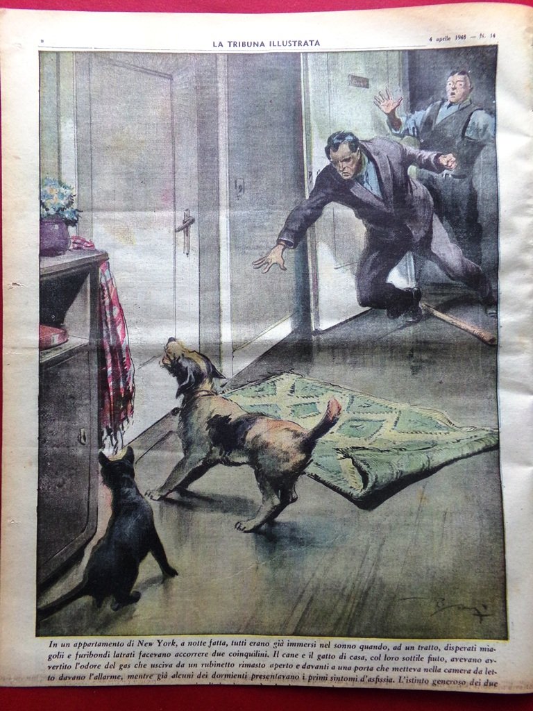 In un appartamento di New York, a notte fatta, tutti erano già immersi nel sonno quando, ad un tratto, disperati miagolii e furibondi latrati facevano accorrere due coinquilini. Il cane e il gatto di casa, col loro sottile fiuto, avevano avevrtito l'odore del gas che usciva da un rubinetto rimasto aperto e davanti a una porta che metteva nella camera da letto davano l'allarme, mentre già alcuni dei dormienti presentavano i primi sintomi d'asfissia (disegno di Vittorio Pisani)
