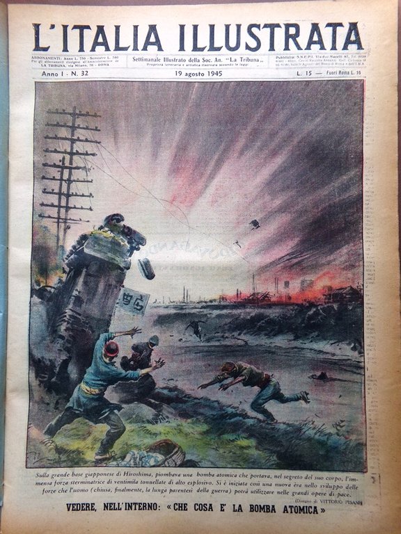 Sulla grande base giapponese di Hiroshima piombava una bomba atomica che portava, nel segreto del suo corpo, l'immensa forza sterminatrice di ventimila tonnellate di alto esplosivo. Si è iniziata così una nuova era nello sviluppo delle forze che l'uomo (chiusa, finalmente la lunga parentesi della guerra) potrà utilizzare nelle grandi opere di pace (disegno di Vittorio Pisani)
