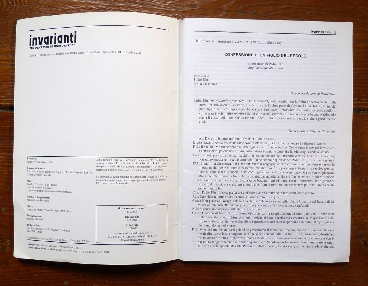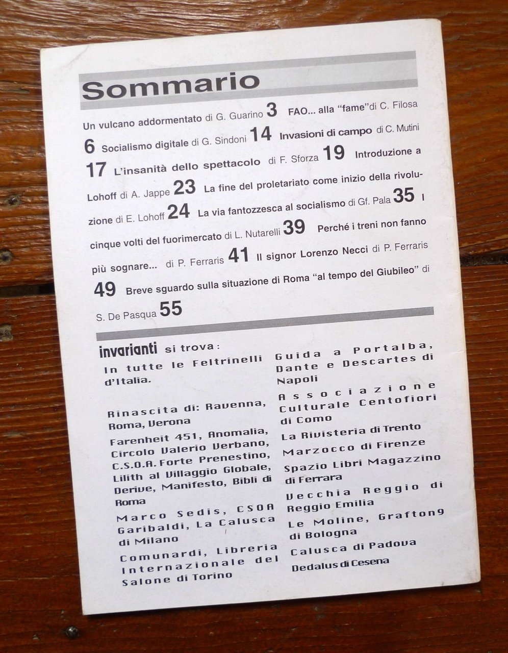 INVARIANTI.PER DESCRIVERE LE TRASFORMAZIONI.TRIMESTRALE POLITICO CULTURALE.- ANNO IV n.14-15 autunno-inverno 1990-1991, pp.106(Dir.resp.: Sonia Trincanato, Antonio Pellicani editore).- NUOVA SERIE ANNO IX n.29 febbraio 1997, pp.58(Dir.resp.: Massimilano Gasperini, stampa tipografia AGEC, Roma).- NUOVA SERIE ANNO XIII n.34 dicembre 2000, pp.75(Dir.resp.: Massimilano Gasperini, stampa tipografia AGEC, Roma).brossura, 29,5x21 cm., illustrazioni in bianco e nero,peso: g.900cod.10246CONDIZIONI DELLE RIVISTE: ottime