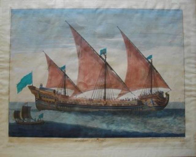 Amsterdam, Chez Pierre Mortier Avec Privilege (senza data ma 1720 circa). Incisione in rame, non coeva ma vecchia coloritura, cm 44 x 56 circa (alla lastra) più margini. Fascinosa veduta con grande nave a vele spiegate in primo piano, il mare tutt’intorno e piccole figure di uomini imbarcati al lavoro, una piccola imbarcazione sulla sinistra nella parte inferiore dell’immagine. Un normale ingiallimento del tempo, in bella coloritura e in ampi margini.