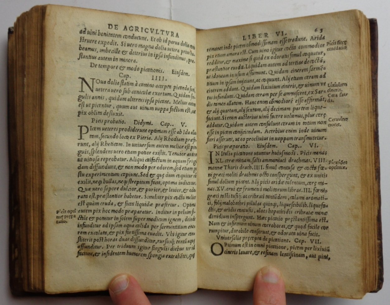 Un volume (10x16,3 cm) di 168-(16) carte. Frontespizio in cornice tipografica architettonica con titolo e indicazioni dello stampatore; marca tipografica e motto in latino e greco all'ultima pagina di testo. Molto interessante la legatura coeva in piena pelle (restauri all'alto del dorso e all'angolo del piatto posteriore) con grande cornice a freddo , fregi arabescati e fioroni ai lati. Esemplare in condizioni molto buone, senza difetti e in legatura coeva di notevole bellezza. Antichi scritti greci sull'agricoltura raccolti intorno al 950 per volere di Costantino Porfirogenito; la parte più antica pare sia costituita da precedente compilazione di Cassiano Basso. Raccolta di venti libri di agronomia, compilata in lingua greca durante il decimo secolo a Costantinopoli nell'Impero Bizantino sotto l'imperatore Costantino VII Porfirogenito. Il curatore di questa edizione fu Ianus Cornarius (1500-1558), medico e umanista tedesco. La raccolta contiene tutto il modo delle informazioni agricole, compresa la meteorologia celeste e terrestre, la viticoltura, l'olivicoltura, l'apicultura, medicina veterinaria, la costruzione di stagni per la piscicultura. L'opera è divisa in venti libri: 1. Dell'atmosfera e dell'aumentare e della regolazione delle stelle - 2. Dei generale generali che appartengono all'agricoltura e dei generi differenti di cereali - 3. Di varie funzioni agricole adatte ad ogni mese - 4/5. Della coltura della vite - 6/8. Del fare del vino - 9. Della coltura dell'oliva e del fare dell'olio - 10-12. Di orticoltura - 13. Degli animali e degli insetti nocivi alle piante - 14. Dei piccioni e di altri uccelli - 15. Delle simpatie e delle antipatie naturali e dell'amministrazione delle api - 16. Dei cavalli, degli asini e dei cammelli - 17. Dell'allevamento del bestiame - 18. Dell'allevamento delle pecore - 19. Dei cani, delle lepri, dei cervi, dei maiali e del salare la carne - 20. Dell'allevamento dei pesci.