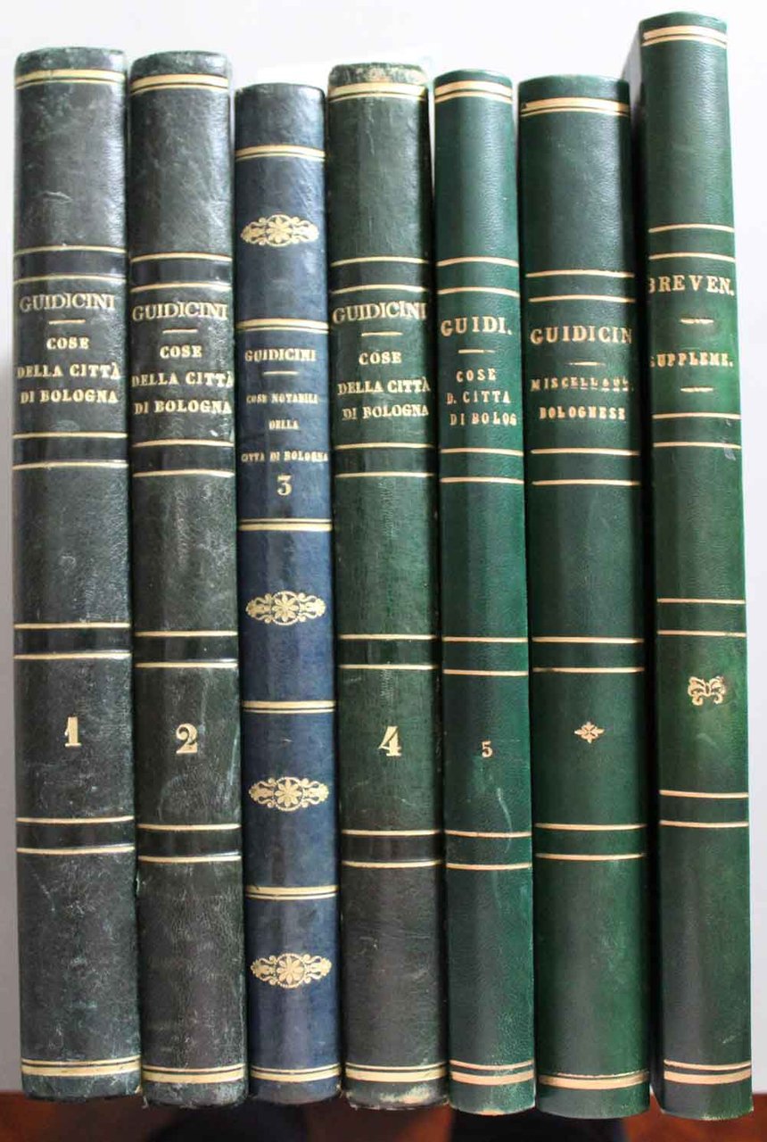 <p>-1908, 7 vol. compresa la miscellanea e il supplemento di Breventani; 32 cm. ril. in mezza pelle, titolo e fregi in oro al dorso, piatti marmorizzati. Vol. I, 1868, p. 510; vol. 2, 1869, p. 422; vol. 3, 1870, p. 383; vol. 4, 1872, p. 383; vol. 5, 1873, p. 254; Miscellanea 1872, p. (8), 391. Il Supplemento, 1908, 33 cm. p. 10, (2), 299, conserva le cop. originali e una pianta di Bologna su doppia pag. f.t. Il terzo vol. ha una rilegatura leggermente diversa, ma omogenea con gli altri volumi. Bell'esemplare in stato di conservazione molto buono, tiratura di soli 500 copie, raro da trovarsi completo</p>