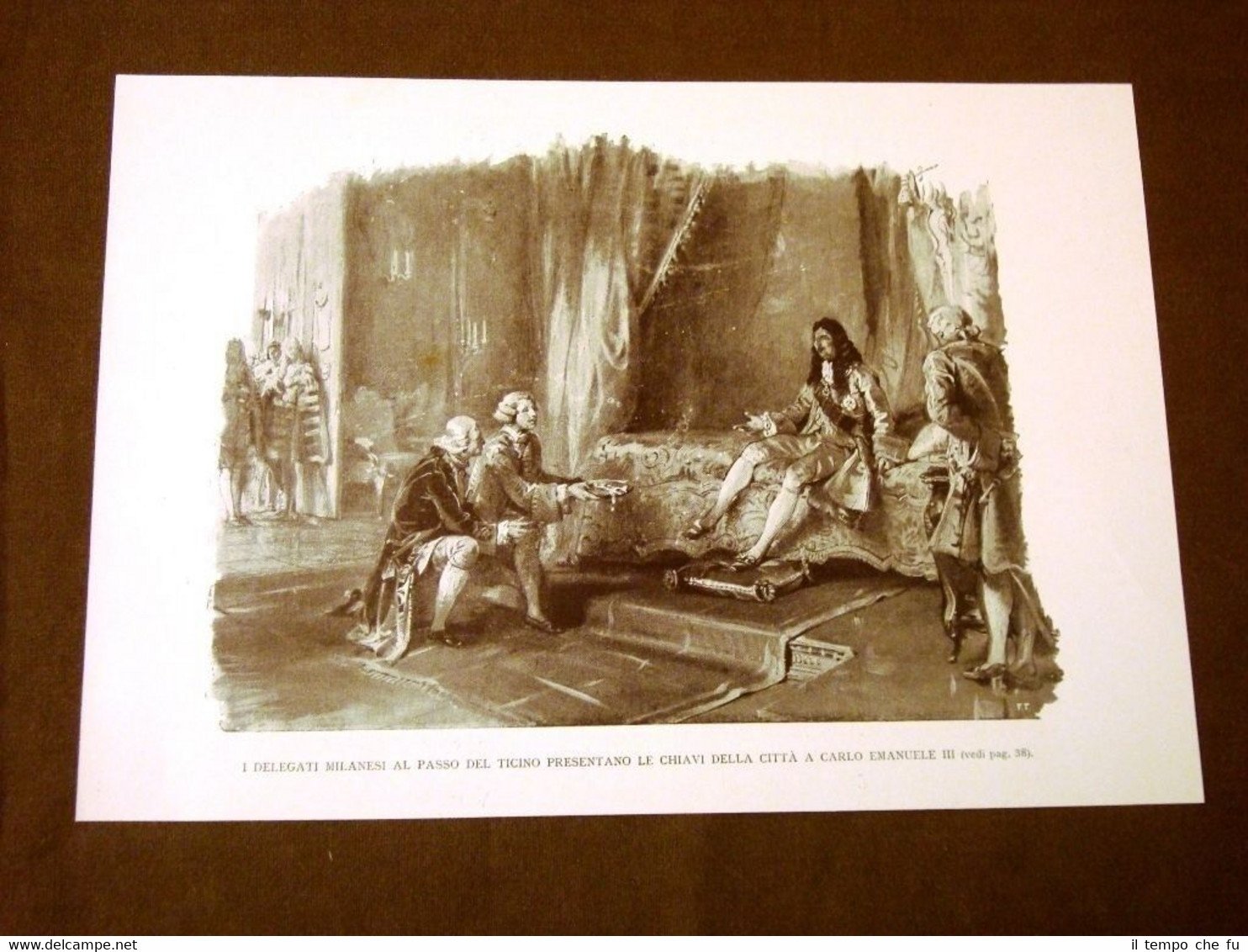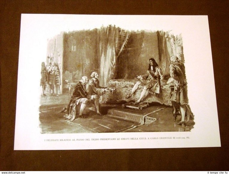 Rara stampa Estratta da pubblicazione dei primi del 1900 Il 700 o Settecento in Italia I delegati di Milano presentano le chiavi della città a Carlo Emanuele III di Savoia Incisione di Lodovico Pogliaghi SDI-020 Dimensioni Cm 26,00 x 19,00 Qualora vogliate delle scansioni migliori contattateci, soddisferemo ogni vostra richiesta. PaypalCarta di creditoBonifico bancario Accuratamente adagiate su un cartoncino e protette da pellicola trasparente rigida,il tutto viene inserito dentro plico di adeguate dimensioni per proteggerne l'integrità.