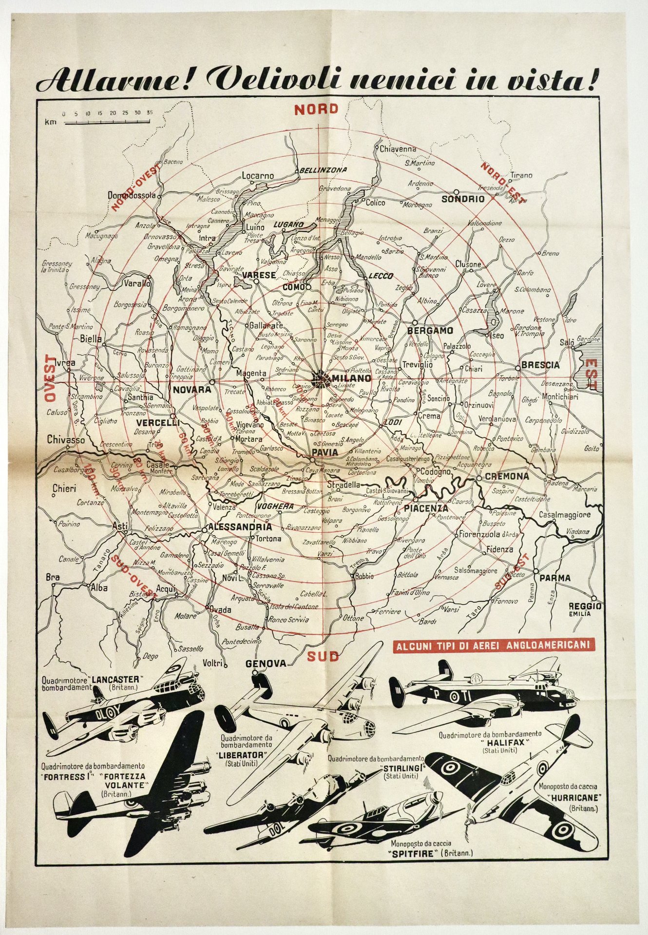 Rara locandina litografico riferito ai bombardamenti alleati raffigurante una carta geografica della Lombardia sovrascritta da un bersaglio con Milano al centro e molti toponimi di città intorno da Chivasso a Domodossola, da Acqui a Parma, in basso sono raffigurati aerei angloamericani (Lancaster, Spitfire, Hurricane, Halifax, Liberator, Stirling e Fortezza volante) mm 520x372, stampato su carta sottile ma eccezionalmente conservato con insignificante brunitura alla piega centrale e lievi tracce di piega