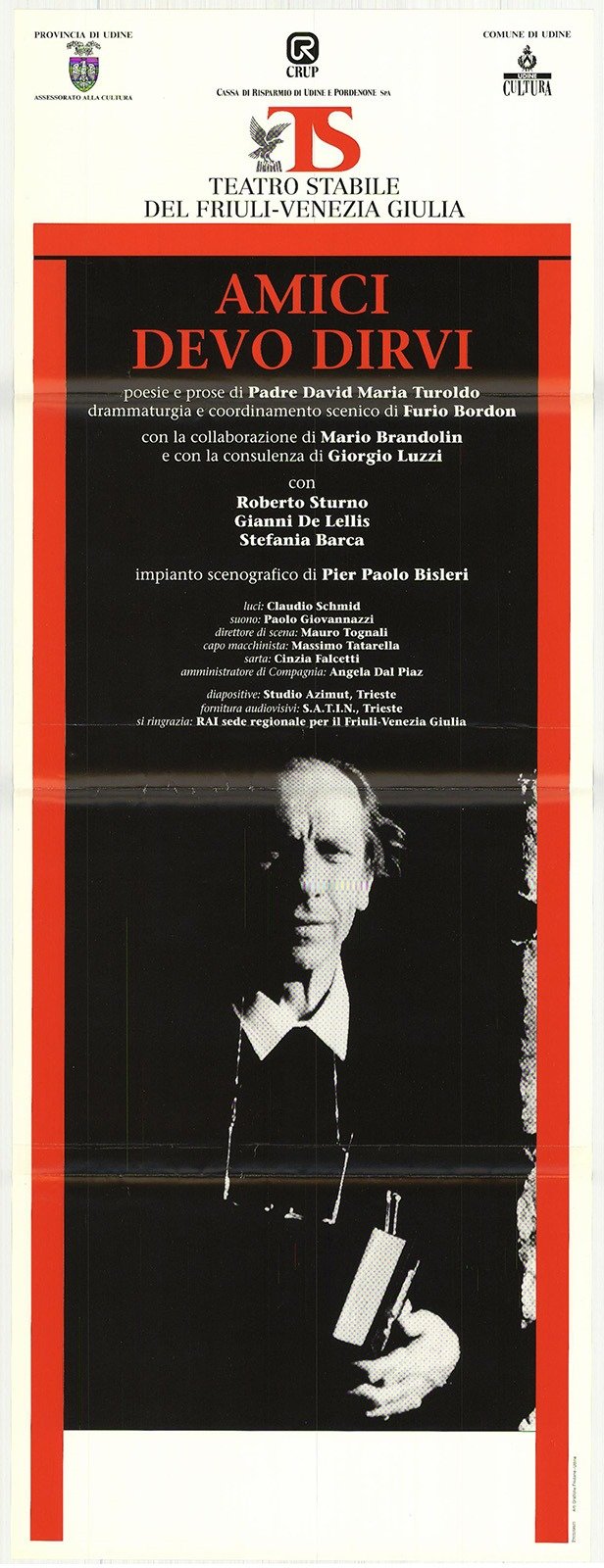 Poesie e prose di Padre David Maria Turoldo, drammaturgia e coordinamento scenico di Furio Bordon. Teatro Stabile del Friuli-Venezia Giulia. Locandina ripiegata più volte
