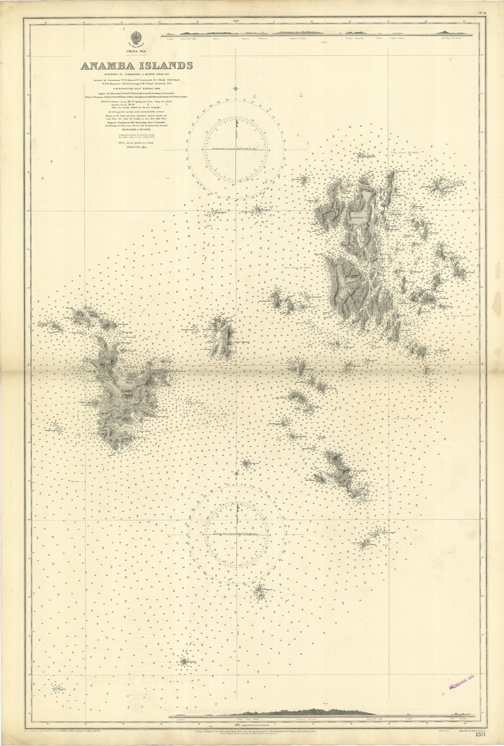 Anamba Islands Surveyed by Commander A. Mostyn Field. Assisted by Lieutenants W.V.S. Howard, F.C. Learmonth, E.C. Hardy, G.E.B. Hand, W.H.D. Margesson, D.E.R. Brownrigg, & Mr. F. Payne, Boatswain. H.M. Surveying ship "EGERIA", 1893.London Published at the Admiralty, 1st April 1895, under the Superintendence of Rear Admiral W.J.L. Wharton, Hydrographer. Small corrections: 1927. Folded