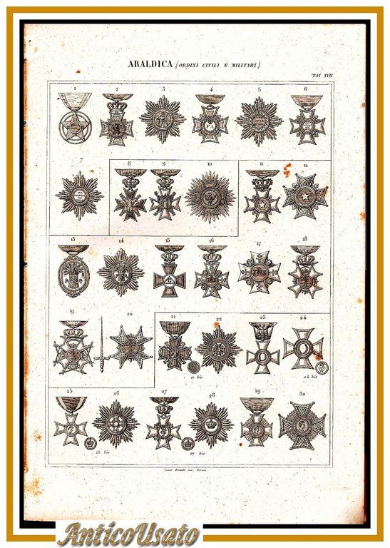 ARALDICA MEDAGLIE ORDINI CIVILI E MILITARI 1866 Tavola XVII Antica Incisione