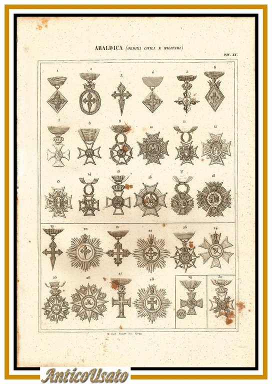 ARALDICA MEDAGLIE ORDINI CIVILI MILITARI 1866 Tavola XX Antica Incisione Stampa