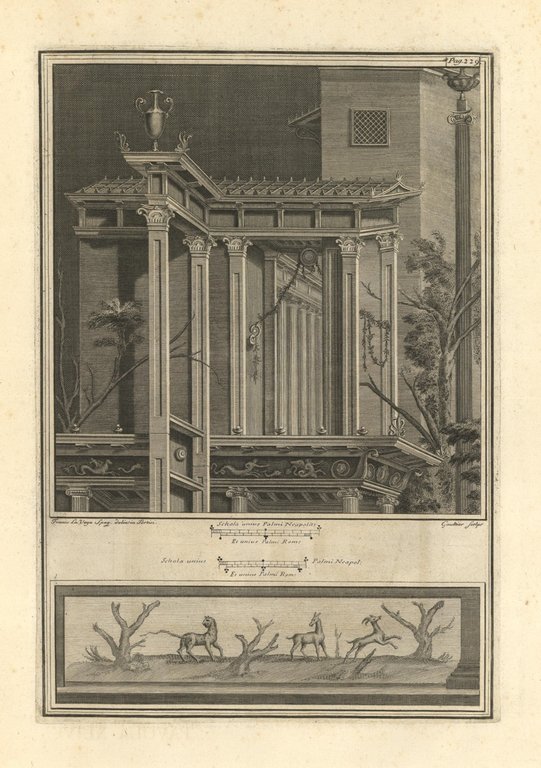 Incisione raffigurante una delle architetture dipinte ritrovate negli scavi. Tratta dal tomo primo della monumentale opera "Le Pitture antiche d'Ercolano e contorni incise con qualche spiegazione", sontuosamente illustrata da diversi artisti tra i quali: Giuseppe Aloja, Nicola Billi, Pietro Campana, Nicola Cesarano, P. Gaultier, Francesco Martano, Filippo Morghen, Camillo Paderni, Rocco Pozzi, N. Ricci, Nicola Vanni, Francisco de Vega. Edita a Napoli dalla Regia Stamperia nel 1757