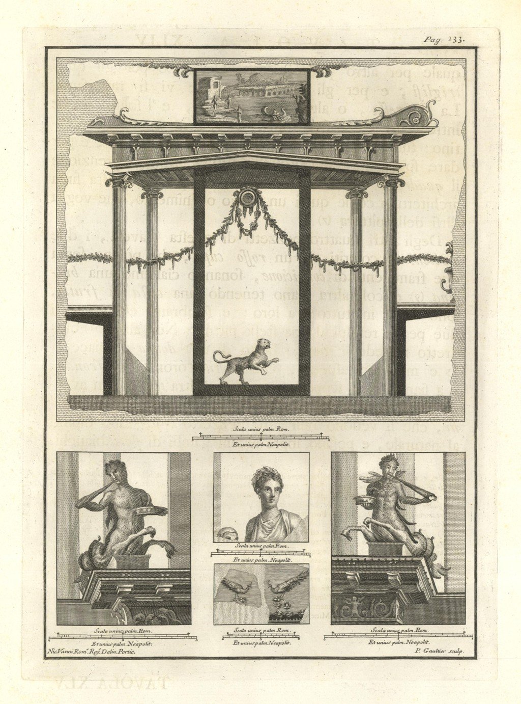 Incisione raffigurante una delle architetture dipinte ritrovate negli scavi. Tratta dal tomo primo della monumentale opera "Le Pitture antiche d'Ercolano e contorni incise con qualche spiegazione", sontuosamente illustrata da diversi artisti tra i quali: Giuseppe Aloja, Nicola Billi, Pietro Campana, Nicola Cesarano, P. Gaultier, Francesco Martano, Filippo Morghen, Camillo Paderni, Rocco Pozzi, N. Ricci, Nicola Vanni, Francisco de Vega. Edita a Napoli dalla Regia Stamperia nel 1757