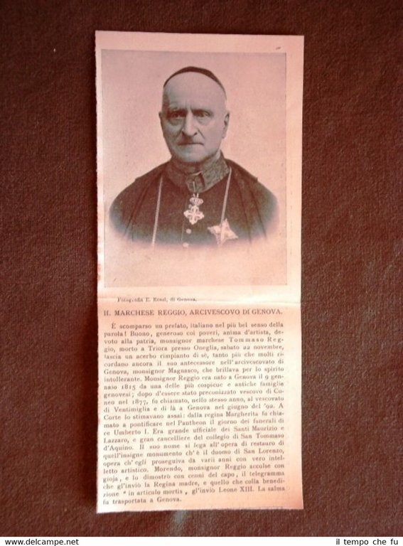 Rara Stampa Estratta da Rivista d'Epoca del 1901 Arcivescovo di Genova Marchese Tommaso Reggio di Genova II1901-048T Dimensioni Cm 8,50 x 19,00 Qualora vogliate delle scansioni migliori contattateci, soddisferemo ogni vostra richiesta. Paypal Carta di credito Bonifico bancario Accuratamente adagiate su un cartoncino e protette da pellicola trasparente rigida il tutto viene inserito dentro plico di adeguate dimensioni per proteggerne l'integrità