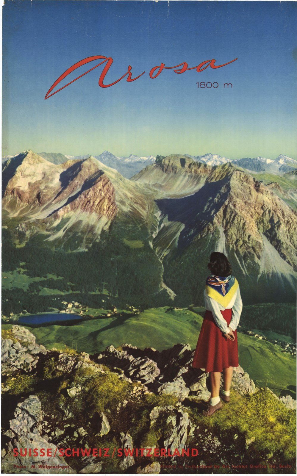 Manifesto originale con veduta sulle montagne di Arosa nel Canton Grigioni. Restauro