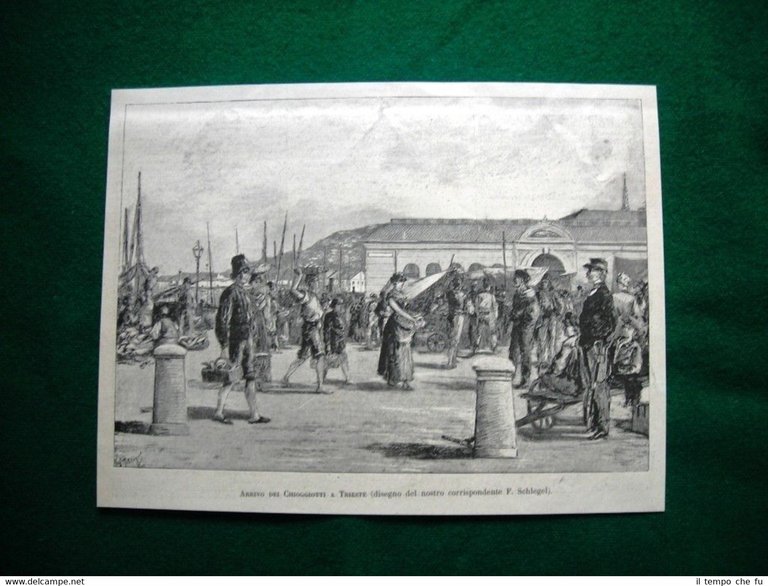 Rara Incisione Estratta da Rivista d'epoca del 1884 Arrivo dei Chioggiotti a Trieste nel 1884 II1884-03 Dimensioni Cm 23,00 x 17,00 Qualora vogliate delle scansioni migliori contattateci, soddisferemo ogni vostra richiesta. PaypalCarta di creditoBonifico bancario Accuratamente adagiate su un cartoncino e protette da pellicola trasparente rigida,il tutto viene inserito dentro plico di adeguate dimensioni per proteggerne l'integrità.