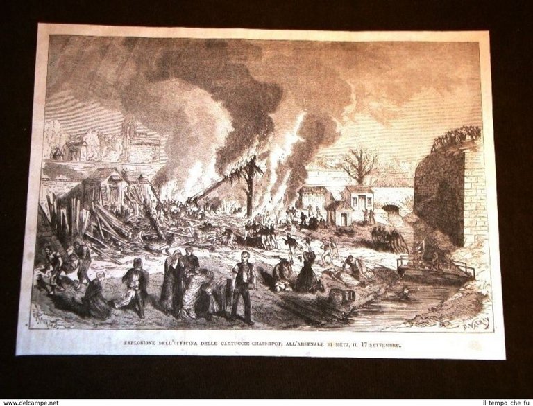 Rara Incisione Estratta da Rivista d'epoca del 1869 Arsenale di Metz nel 1869 Esplosione dell'Officina delle cartuccie Chassepot UI1869-023T Dimensioni Cm 25,00 x 18,50 Qualora vogliate delle scansioni migliori contattateci, soddisferemo ogni vostra richiesta. Paypal Carta di credito Bonifico bancario Accuratamente adagiate su un cartoncino e protette da pellicola trasparente rigida il tutto viene inserito dentro plico di adeguate dimensioni per proteggerne l'integrità