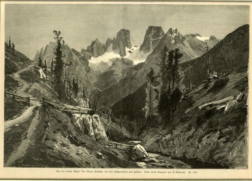 Aus den tiroler Alpen: der Monte Cristallo, von den Plätzenwiesen aus gefehn. Nach einem Acqurell von U. Lutteroth.