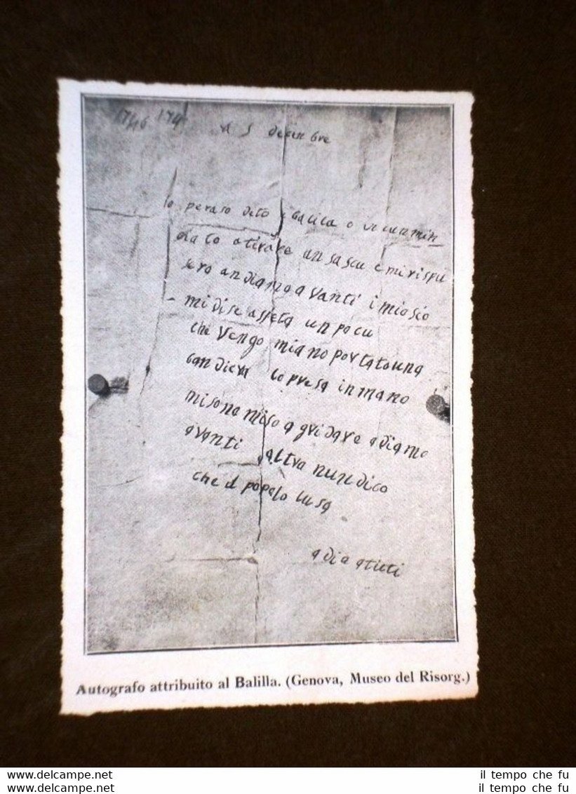 Rara Stampa Estratta da Rivista d'epoca del 1920 Autografo attribuito a Giovan Battista Perasso o Giambattista di Genova Balilla II1920-033T Dimensioni Cm 8,00 x 11,50 Qualora vogliate delle scansioni migliori contattateci, soddisferemo ogni vostra richiesta. Paypal Carta di credito Bonifico bancario Accuratamente adagiate su un cartoncino e protette da pellicola trasparente rigida il tutto viene inserito dentro plico di adeguate dimensioni per proteggerne l'integrità