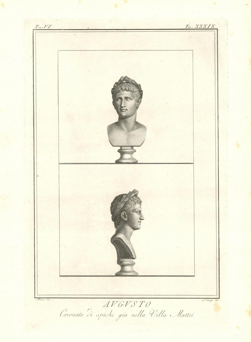 Il pregevole busto, adornato da una corona di spighe, poggiato su un piedistallo, raffigura Gaio Giulio Cesare Ottaviano Augusto (Roma, 63 a.C. – Nola, 14 d.C.) meglio conosciuto come Ottaviano o Augusto, fu il primo imperatore romano. Restò al potere sino alla morte, e il suo principato fu il più lungo della Roma imperiale (44 anni). L'età di Augusto rappresentò un momento di svolta nella storia di Roma e il definitivo passaggio dal periodo repubblicano al principato. Inserita nell'opera "Il Museo Pio-Clementino descritto da Ennio Quirino Visconti Direttore del Museo Capitolino - Tomo sesto - Dedicato alla Santita di Nostro Signore PIO SESTO Pontefice Massimo. Edito da Luigi Mirri / Mercante di quadri incontro il Palazzo Bernini. In Roma MDCCXCII con Privilegio Pontificio. Opera dedicata ai Busti del Museo Pio-Clementino