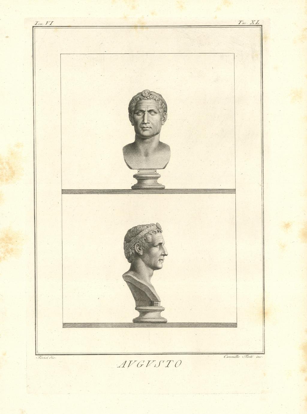 Il pregevole busto, poggiato su un piedistallo, raffigura Gaio Giulio Cesare Ottaviano Augusto (Roma, 63 a.C. – Nola, 14 d.C.) meglio conosciuto come Ottaviano o Augusto, ornato sul capo da un nastro e una gemma. Fu il primo imperatore romano e restò al potere sino alla morte, il suo principato fu il più lungo della Roma imperiale (44 anni). L'età di Augusto rappresentò un momento di svolta nella storia di Roma e il definitivo passaggio dal periodo repubblicano al principato. Inserita nell'opera "Il Museo Pio-Clementino descritto da Ennio Quirino Visconti Direttore del Museo Capitolino - Tomo sesto - Dedicato alla Santita di Nostro Signore PIO SESTO Pontefice Massimo. Edito da Luigi Mirri / Mercante di quadri incontro il Palazzo Bernini. In Roma MDCCXCII con Privilegio Pontificio. Opera dedicata ai Busti del Museo Pio-Clementino. Leggeri segni di foxing