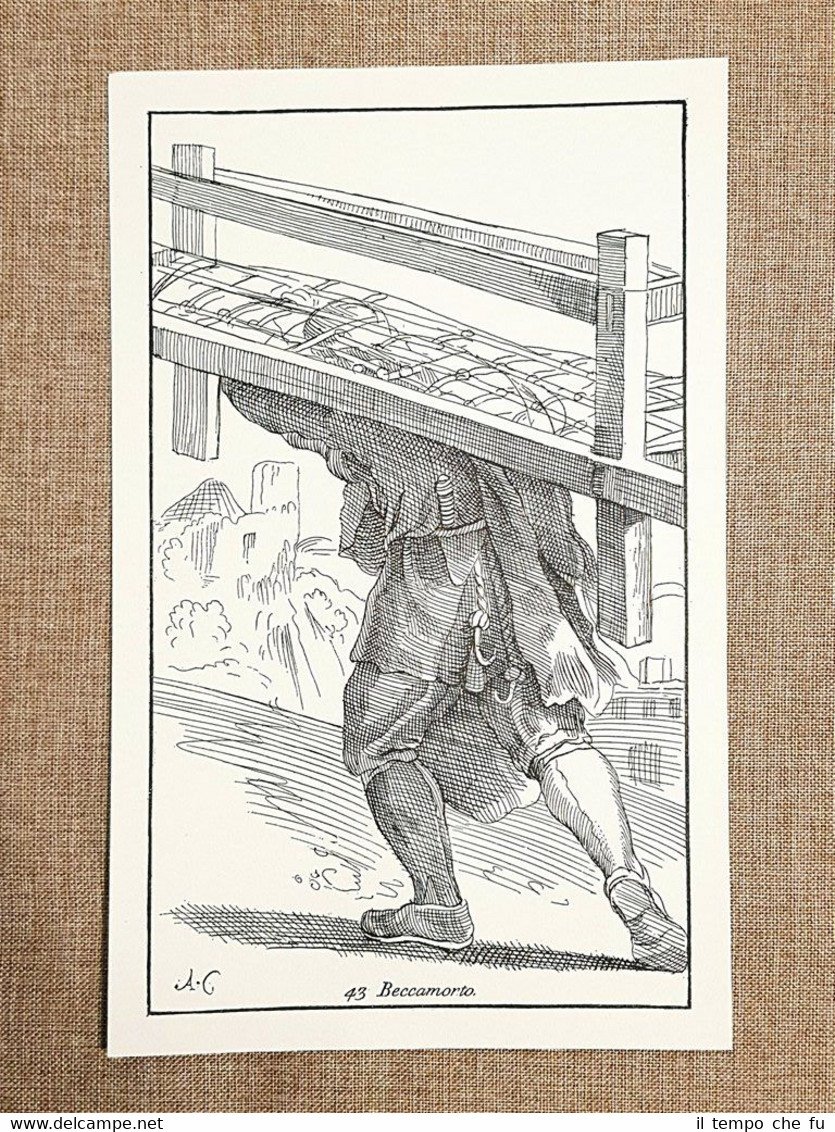 Beccamorto Arti Bologna Tavola di Annibale Carracci del 1646 Costume Ristampa Rara tavola estratta da pubblicazione di metà del '900Stampata su carta speciale e non retroscritta Beccamorto Antico mestiere Moda e costume Estratta da Le arti di Bologna di Annibale Carracci del 1646 Ristampa Codice articolo: VIP-155Dimensioni: Cm 18,00 x 29,00