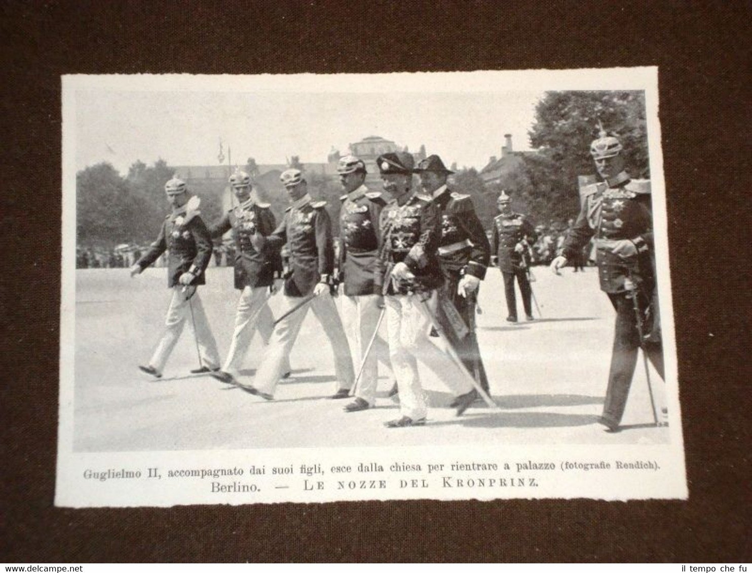 Rara Stampa Estratta da Rivista d'epoca del 1905 Berlino nel 1905 Le nozze del Kronprinz L'Imperatore Guglielmo II e figli II1905-023T Dimensioni Cm 15,00 x 11,00 Qualora vogliate delle scansioni migliori contattateci, soddisferemo ogni vostra richiesta. Paypal Carta di credito Bonifico bancario Accuratamente adagiate su un cartoncino e protette da pellicola trasparente rigida il tutto viene inserito dentro plico di adeguate dimensioni per proteggerne l'integrità