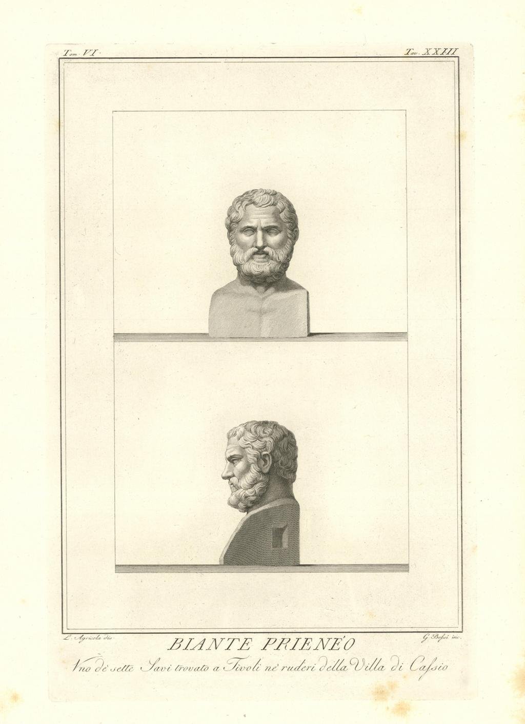 L’aspetto saggio e sicuro di questo busto appartiene a Biante di Priene, uomo politico greco vissuto al tempo della conquista persiana delle città ioniche, e uno dei Sette Saggi, o Sapienti. Inserita nell'opera "Il Museo Pio-Clementino descritto da Ennio Quirino Visconti Direttore del Museo Capitolino - Tomo sesto - Dedicato alla Santita di Nostro Signore PIO SESTO Pontefice Massimo. Edito da Luigi Mirri / Mercante di quadri incontro il Palazzo Bernini. In Roma MDCCXCII con Privilegio Pontificio. Opera dedicata ai Busti del Museo Pio-Clementino. Leggeri segni di foxing al margine