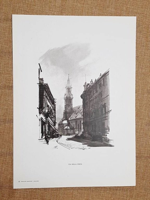 Bolzano La Via della Posta Disegno di Luciano Guarnieri Tavola del 1957