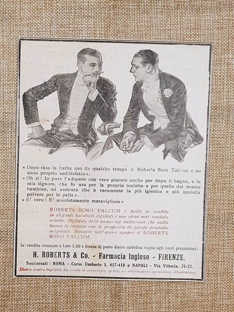 Boro talcum o Borotalco Roberts Farmacia inglese Firenze Pubblicità del 1914 (2) Rara stampa estratta da pubblicazione del 1914 Boro talcum o Borotalco Roberts Farmacia inglese Firenze Pubblicità del 1914 Codice prodotto: VIP-183 Dimensioni Cm 12,00 x 15,00