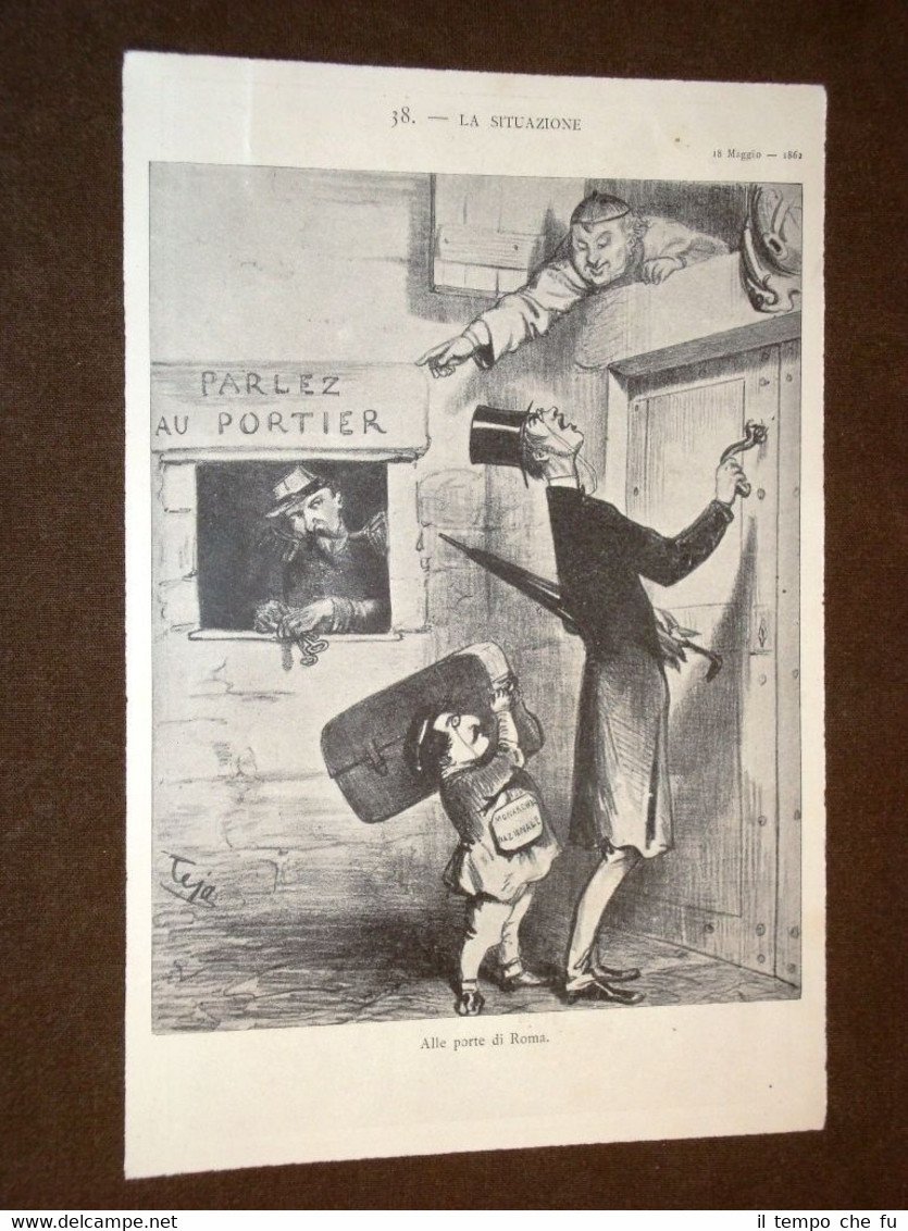 Rara stampa Estratta da pubblicazione d'epoca del 1900 . .stampa che ha quindi oltre 114 anni! Caricature di Casimiro Teja apparse sul Pasquino Rattazzi e Marazio tentano di risolvere la questione romana con la Santa Sede + La caduta del gabinetto Rattazzi dopo i fatti di Sarnico e Aspromonte Ristampe di caricature apparse sul Pasquino del 18 maggio e 7 dicembre 1862 Teja-002 Dimensioni Fronte/retro Cm 15,00 x 22,00 + Cm 22,00 x 15,00 Casimiro Teja, noto anche con il nome d'arte "Puff" (Torino, 1830 - 1897), è stato un fumettista italiano. Con lo pseudonimo "Puff" collaborò con la rivista satirica liberale Il Fischietto, fondata dal caricaturista Lorenzo Pedrone (Icilio). Disegnatore al Pasquino dal 1856, pochi anni dopo ne ottenne la direzione, che tenne fino al 1897.A lui si deve la celebre frase Piove, governo ladro!, apparsa in un Pasquino del 1861 in occasione di una manifestazione di mazziniani andata a monte a causa della pioggia. Collaborò inoltre con le riviste satiriche La lanterna magica, Le scintille e Spirito Folletto. La sua satira prese spesso di mira la Chiesa, i medici e i farmacisti, ridicolizzati come ciarlatani, e Giovanni Giolitti, che Teja soprannominò "Palamidone" (cioè "lunga palandrana"). Fu anche pittore e un suo quadro è conservato al Museo del Risorgimento. Appassionato di alpinismo, fu tra i primi aderenti al Club Alpino Italiano. Torino gli ha dedicato nel 1904 un monumento, eseguito da Edoardo Rubino, che lo ritrae sotto una copia del busto romano del Pasquino. Il monumento si trova attualmente in largo IV marzo. Nel 2013 è stato ricordato dall'Archivio di Stato di Torino con la mostra Casimiro Teja, sulla vetta dell'umorismo", curata dai disegnatori Claudio Mellana e Dino Aloi. Il Pasquino fu un settimanale satirico fondato a Torino nel 1856 dai giornalisti Giuseppe Augusto Cesana e Giovanni Piacentini, pubblicato fino al1930, quando fu soppresso dal fascismo. Il primo numero uscì il 27 gennaio 1856, con una testata disegnata dal caricaturista Casimiro Teja. Settimanale in uscita la domenica, di ispirazione liberale, aspirava a rivolgersi a tutti gli italiani e per questo prendeva il nome dalla "statua parlante" di Roma, simbolo per eccellenza della satira politica. Teja lo diresse per quarant'anni, fino all'ultimo giorno della propria vita. Inizialmente Il Pasquino non si interessò di politica, anche per non entrare in concorrenza con l'altro periodico torinese Il Fischietto, ma un po' per volta iniziò a occuparsene sempre più apertamente, tanto da interessare la censura. Anche dopo il trasferimento della capitale (e di uno dei suoi fondatori, Giuseppe Cesana) a Firenze, Il Pasquino rimase pubblicato a Torino: il suo direttore Teja dichiarò in proposito: «Fuori Torino, Pasquino non potrebbe vivere.» La sua satira adottò sempre toni piuttosto delicati, tanto che lo scrittore Edmondo De Amicis dichiarò «tutti gli avversari che Teja bollò nel Pasquino gli possono stringere la mano». Tra i suoi bersagli più frequenti compariva il politico Agostino Depretis, "l'uomo del trasformismo". Alla satira politica e di costume si affiancarono nel tempo rubriche dedicate alla moda ("Mode"), alle recensioni ("Biblioteca") e al teatro ("Colpo di Cassa"). La sua influenza sul pubblico fu tale che a Roma uscirono anche un Pasquino di Roma, nel 1870, e un Figlio di Pasquino, nel 1893. Dopo la morte di Teja nel 1897, la rivista fu diretta da Giorgio Ansaldi (Dalsani), Luigi Sapelli (Caramba), Eugenio Colmo (Golia), Giovanni Manca,Tarquinio Sini e Enrico Gianeri (Gec). Nel 1930 Il Pasquino fu soppresso dal fascismo. Qualora vogliate delle scansioni migliori contattateci, soddisferemo ogni vostra richiesta. PaypalCarta di creditoBonifico bancario Accuratamente adagiate su un cartoncino e protette da pellicola trasparente rigida,il tutto viene inserito dentro plico di adeguate dimensioni per proteggerne l'integrità. "