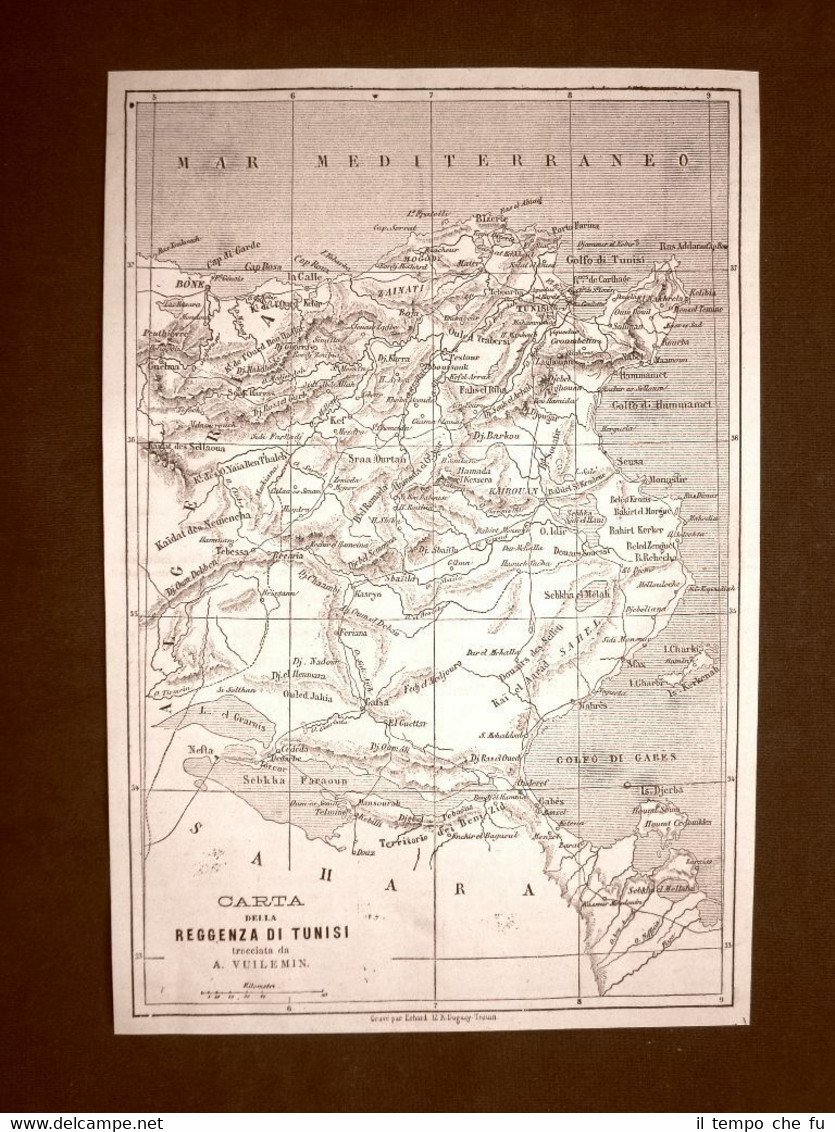 Carta cartina mappa del 1863 Reggenza di Tunisi Vuilemin + Bairam Kasbah Tunisi