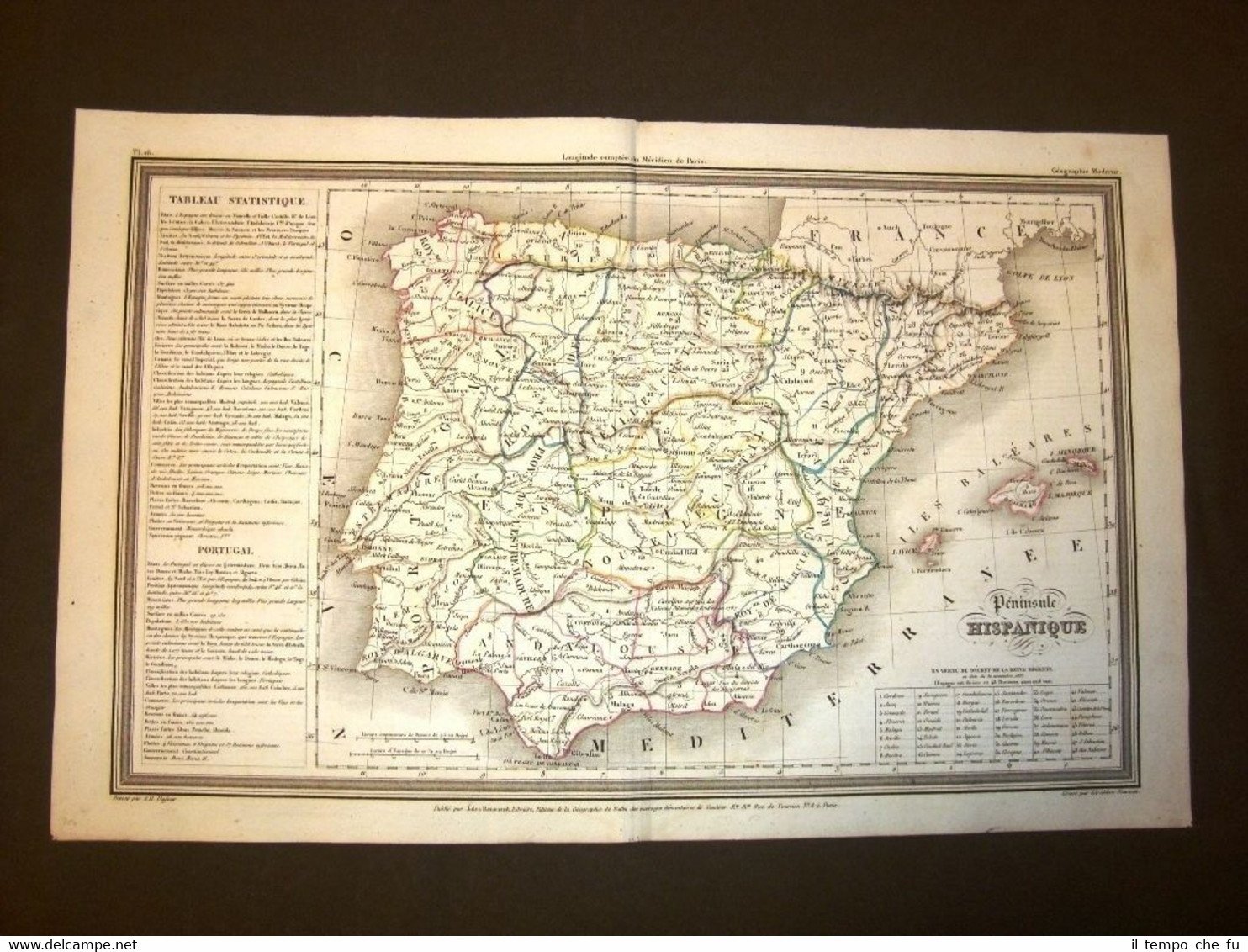 Grande carta geografica o mappa estratta da raro Atlante Dufour del 1840 Illuminata ed incisa in rame Large and ancient map of Dufour's Atlas year 1840 Illuminated and engraved copper Spagna o penisola spagnola Spain or the Spanish peninsula Con informazioni statistiche Geo-027 Dimensioni Cm 43,00 x 27,00 Qualora vogliate delle scansioni migliori contattateci, soddisferemo ogni vostra richiesta. PaypalCarta di creditoBonifico bancario Accuratamente adagiate su un cartoncino e protette da pellicola trasparente rigida,il tutto viene inserito dentro plico di adeguate dimensioni per proteggerne l'integrità.