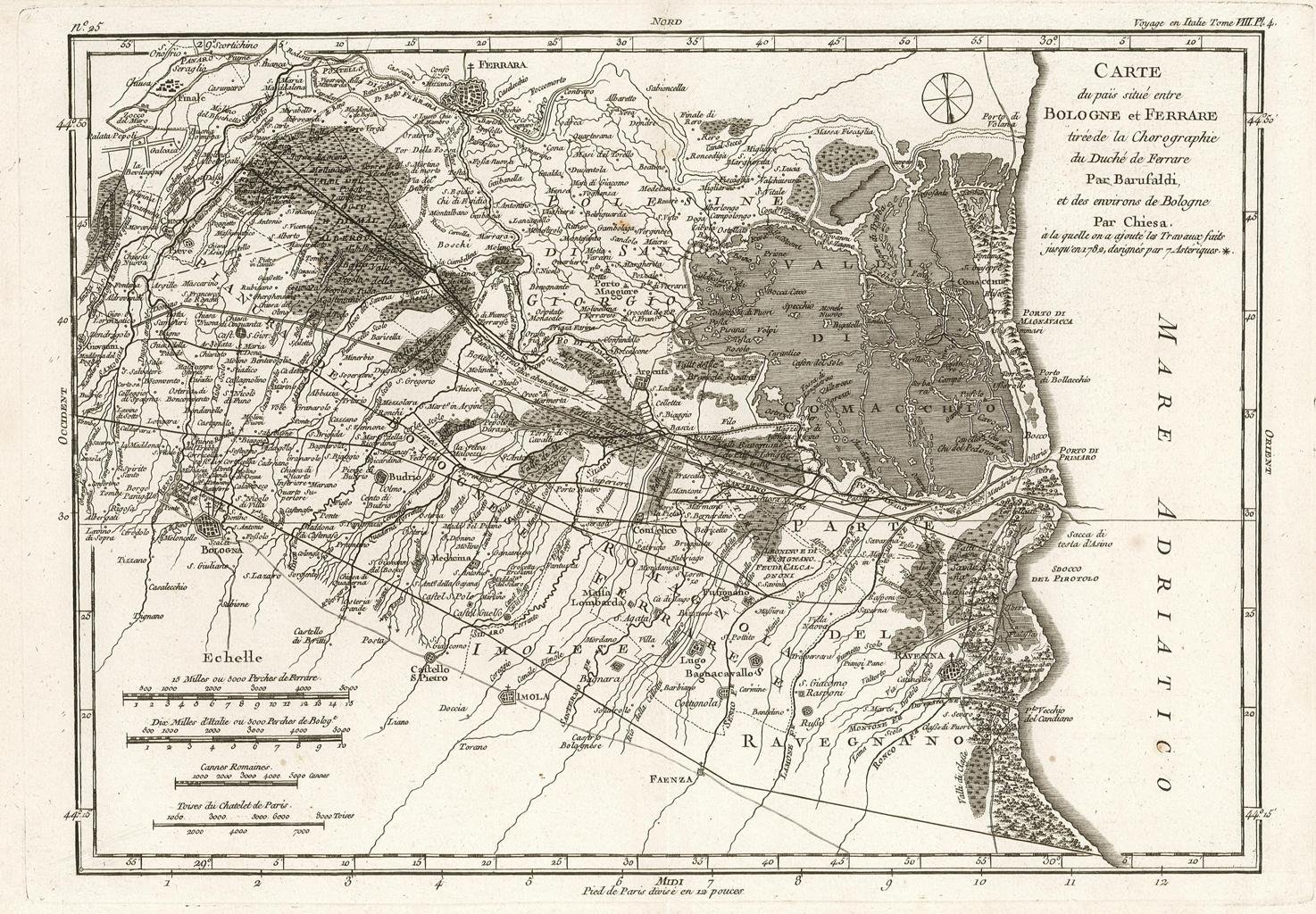 Carte du pais situé entre Bologne et Ferrare tirée de la Chartographie du Duché de Ferrare par Barufaldi, et des environs de Bologne Par Chiesa.