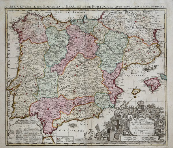 Mappa rara di Spagna e Portogallo, pubblicata da Perre Husson all'Aia (Den Haag), che identifica una serie di battaglie significative combattute durante la guerra di successione spagnola.Esemplare del secondo stato, pubblicato da Rainer & Joshua Ottens, Amsterdam intorno al 1750.La mappa include una serie di battaglie, tra cui una rappresentazione grafica della battaglia navale di Velez-Malaga (24 agosto 1704), la più grande battaglia navale combattuta durante la guerra di successione spagnola, insieme a una rappresentazione di una più grande battaglia navale al largo la costa catalana, rappresentante dell'assedio di Barcellona da parte degli inglesi sotto il conte di Peterborough. Altre battaglie notate includono la Baia di Vigo (23 ottobre 1702) e l'assedio di Gibilterra (24 luglio 1704).Il dettaglio nella mappa è eccellente, inclusa una rappresentazione delle strade in tutta la penisola iberica.La mappa comprende 16 stemmi, montati su un cartiglio elegantemente inciso.Incisione in rame, bella coloritura coeva, in ottimo stato di conservazione. Rare map of Spain and Portugal, published by Perre Husson in the Hague (Den Haag), identifying a number of the significant battles fought duing the war of Spanish Succession.Example of the second state, published by Rainer & Joshua Ottens, Amsterdam circa 1750.The map includes a number of battles, including a graphic depiction of the naval Battle of Velez-Malaga (August 24, 1704), the largest naval battle fought during the War of the Spanish Succession, along with a representation of a larger naval battle off the Catalan Coast, representative of the Siege of Barcelona by the British under the Earl of Peterborough. Other battles noted include the Bay of Vigo (October 23, 1702) and the Siege of Gibraltar (July 24, 1704).The detail in the map is excellent, including a depiction of the roads throughout the Iberian Peninsula.The map includes 16 coats of arms, mounted on an elegantly engraved cartouche. A fine example of this rare and highly detailed map.Copperpalte with fine original colour, very good condition. Cfr.