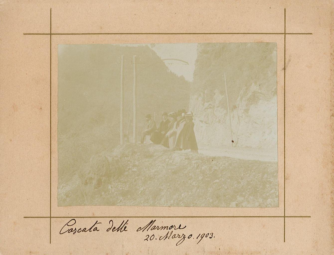 Fotografia, antica ed originale, raffigurante un momento di una passeggiata del 30 marzo 1903 alla Cascata delle Marmore. Applicata su cartoncino editoriale coevo