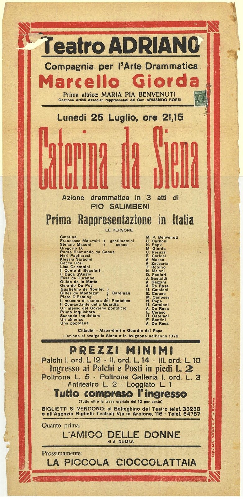 Compagnia per l'Arte Drammatica Marcello Giorda. Prima attrice Maria Pia Benvenuti. Tip. Lit. Nava e C. - Roma. Locandina ripiegata più volte con strappi e mancanze. Marca da bollo applicata